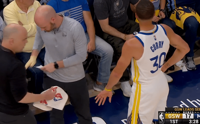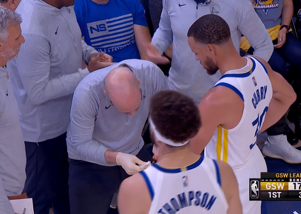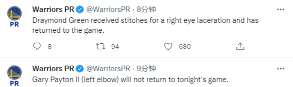 格林重返赛场后,镜头拍到格林的右眼明显肿胀,缝针后带伤出战;另外库里的手指划破,止血后继续比赛;勇士本场已经有3名主力受伤,其中小佩顿因伤提前退赛。