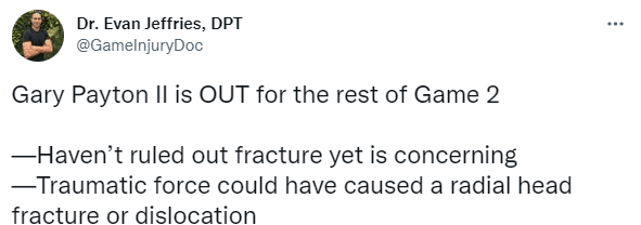 医学专家evan jeffries详解小佩顿伤情,发推写道:小佩顿因伤缺席G2剩余比赛,他可能遭遇骨折的严重伤病。