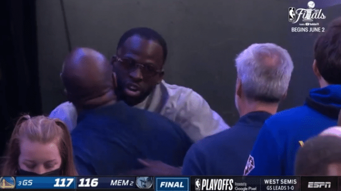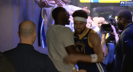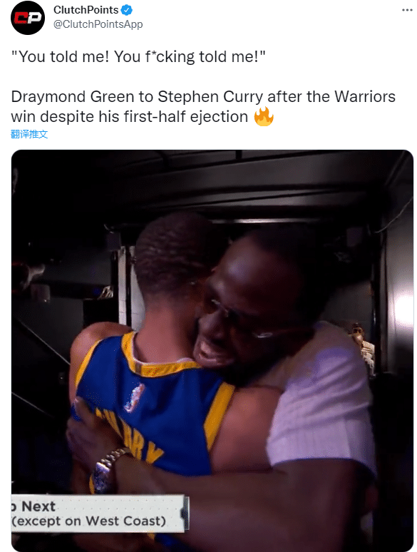 勇士赢球后,上半场被驱逐的格林站在球员通道入口处,戴着眼镜拥抱勇士众球员和教练组成员,此时格林疯狂宣泄内心的情绪;格林拥抱库里时,高呼:你告诉我的,你TM告诉我的;在格林被驱逐时,库里告诉格林他一定会带队拿下胜利。