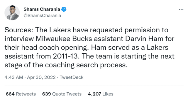 JRS直播网04月30日讯 ,名记查拉尼亚报道了湖人选帅的最新进展,他们已经提交了面试雄鹿助教达尔文-汉姆的申请,另据名记马克-斯坦恩报道,湖人对爵士主教练斯奈德也非常有兴趣,如果爵士和斯奈德分道扬镳,湖人也会考虑邀请他来执教。