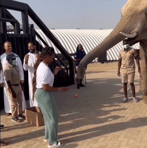 同时詹姆斯等人与迪拜富豪们去看大象和长颈鹿,一行人坐着观光车,看着大象吃东西。詹嫂还拿食物去喂大象,结果掉落在地上,詹姆斯录着视频,也很担心,确实非常暖。