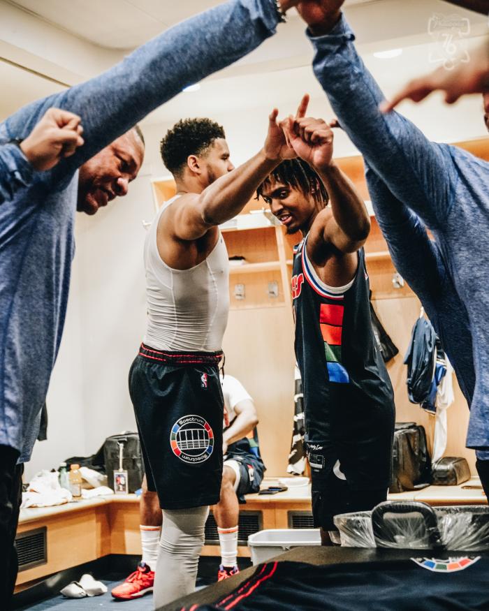 76人更衣室庆祝曝光,马克西和哈登等队友击掌庆祝,之后里弗斯声音沙哑地发表讲话,最后全队一起击掌并高呼加油。