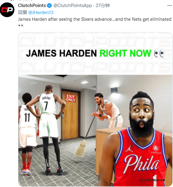 哈登晋级东部半决赛,美媒Clutch Points在评论区晒P照扎心篮网(图中塔图姆正拿着扫帚清扫杜兰特和欧文),配文写道:当哈登看到76人晋级,篮网被凯尔特人横扫时的反应;今年季后赛,篮网0-4被凯尔特人横扫出局,无数球迷调侃哈登做对了决定。