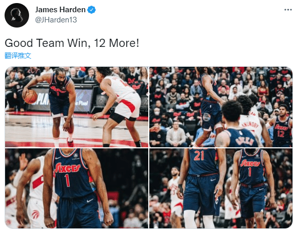 JRS直播网04月29日讯 ,76人首轮4-2淘汰猛龙,哈登全场12投7中拿到22分15助攻6篮板,在场正负值+38;赛后哈登更新社交媒体,晒赛场照并且发推庆祝晋级半决赛:很棒的团队胜利,(距离总冠军)还差12场胜利。