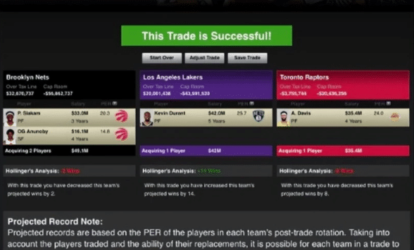 美媒FW的设想是三方交易,湖人、猛龙和篮网三方大交易,涉及到浓眉哥奔赴猛龙、西亚卡姆+阿奴诺比去到篮网、杜兰特奔赴湖人,这样的交易就可以实现詹姆斯和杜兰特的联手。