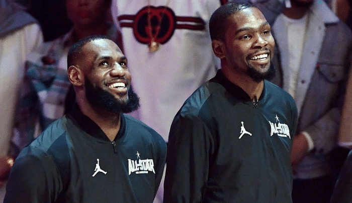已经有美媒开始设想,若杜兰特加盟湖人,湖人能达到什么高度?还晒出了杜兰特身穿湖人35号战袍的P图,也引发很多球迷的热议,大家纷纷表示如果是健康的杜兰特和詹姆斯,两人一定会迸发出巨大的火花,詹姆斯的传球、杜兰特关键时刻的能力,都将得到淋漓尽致的体现。