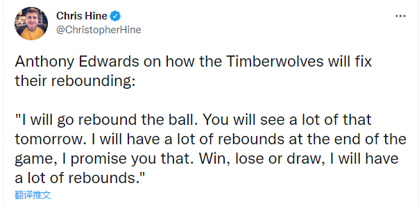 两队G6将在明天上午9点开打,对于森林狼来说,这是一场生死战;对于G6,状元爱德华兹表示:我保证会抢一堆篮板,我很期待这场比赛,因为压力太大了,我会尽一切办法来帮助球队赢得比赛,我现在的感觉比任何时候都要好。