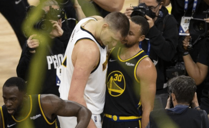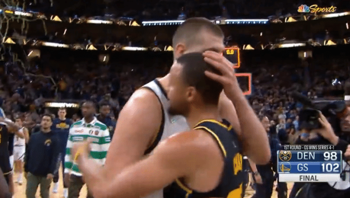 JRS直播网04月28日讯,勇士主场拿下系列赛第五场,总比分4-1淘汰掘金从而杀进西部半决赛;库里全场轰下30分5篮板5助攻,下半场独砍20分以及末节关键时刻接管比赛;约基奇狂砍30分19篮板8助攻拼尽全力仍遗憾出局,赛后约基奇拥抱勇士众球星,满脸笑容表达敬意。