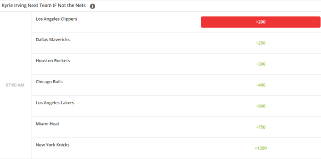 该赔率显示的是若欧文离开篮网,他下一支效力的是哪支球队?上榜的一共有7队。具体排名如下:1.快船(+200)、2.独行侠(+250)、3.火箭(+300)、4.公牛(+400)、5.湖人(+600)、6.热火(+750)、7.尼克斯(+1200)