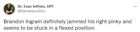之后一个回合,英格拉姆持球单挑布里奇斯,手部受伤导致丢球失误,此时莺歌又是一脸痛苦,医学专家Evan Jeffries发推写道:英格拉姆应该是扭伤了右小指。