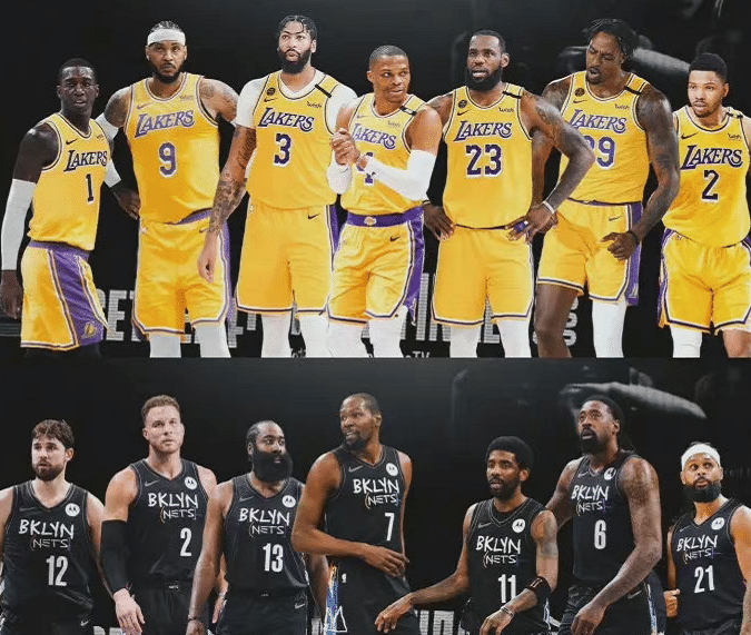 当时不少人看好湖人和篮网是有原因的,篮网拿下奥运会表现出色的米尔斯、续约努力的格里芬、迎回阿德等人,再加上杜兰特、欧文和哈登三巨头,实力非常强大。湖人方面换来威少,迎回朗多、霍华德,引进安东尼等人,组成众星云集的超豪华阵容,年龄虽然偏大,但是被看好可以在季后赛中教训那些年轻人,正如威少当时都表示会在季后赛狠狠踢对手的屁股,豪气冲天。
