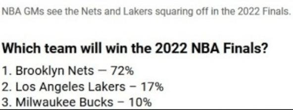 也确实,本赛季的NBA开始前不少人看好篮网、湖人夺得总冠军,其中在NBA官方的一项联盟总经理调查中,就可以得到最直观的体现,因为有72%的总经理觉得篮网会夺冠,17%的总经理认为湖人夺冠,篮网和湖人排名第一和第二名。卫冕冠军雄鹿排名第三,得票率是10%!