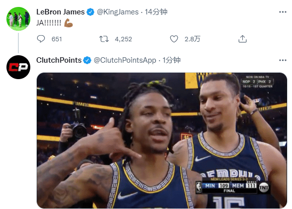 莫兰特封神一战冲上热搜引热议,赛后爆粗口直言:告诉他们Fxxking给我打电话;詹姆斯发推狂赞莫兰特:贾!!!(秀肌肉表情)。