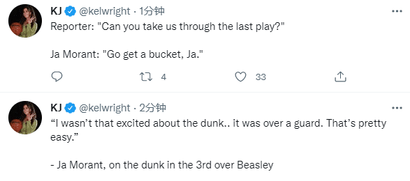 赛后莫兰特回应隔扣比斯利,表示:我并没有感到兴奋,因为隔扣一个后卫是很轻松的一件事。