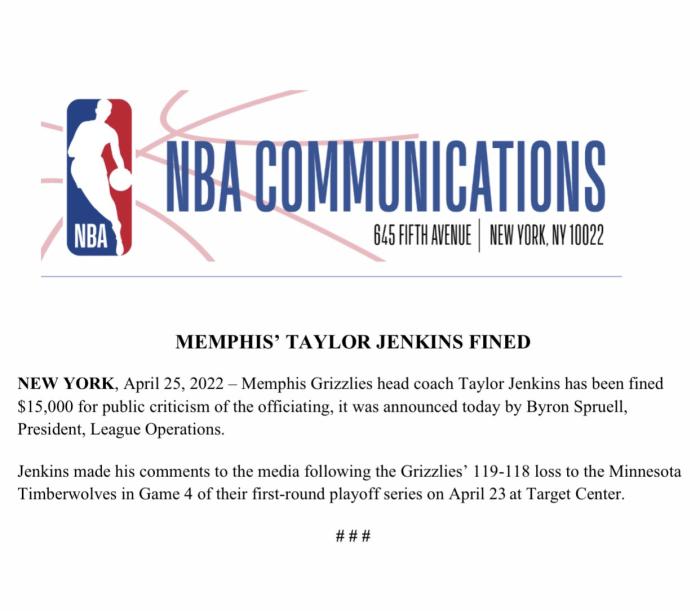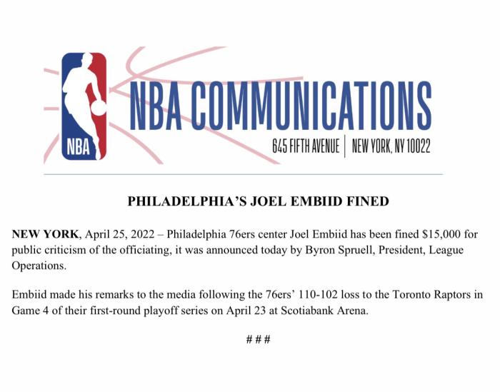 JRS直播网04月26日讯 ,NBA官方正式公布两笔罚单,76人球星恩比德和灰熊主帅詹金斯都因公开批评裁判而被罚款1.5万美元。