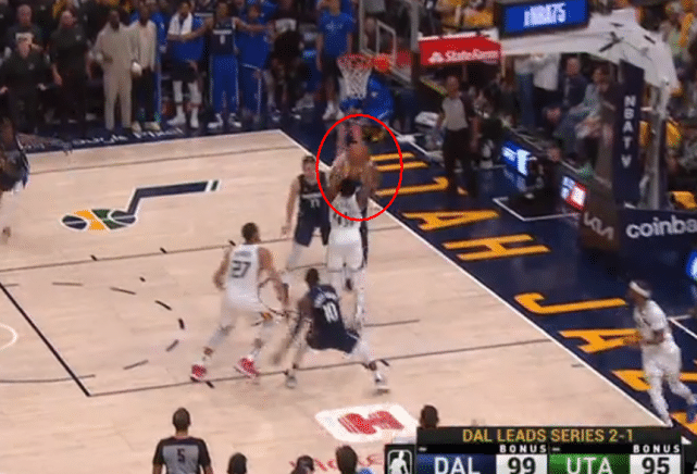 米切尔在对抗时,伸手打到了鲍威尔的面部,鲍威尔直接倒地,影响了他对篮筐的保护,这是一次漏吹的进攻犯规,爵士明显获利。米切尔随后利用这个机会打进关键2+1,缩小分差,然后才有机会和戈贝尔完成空接,绝杀了独行侠。