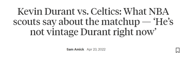 JRS直播网04月24日讯 ,The Athletic名记萨姆-阿米克分别从东部和西部邀请了一名球探,来探讨篮网和绿军的系列赛,而解析的主要问题就是杜兰特系列赛至今的失常表现。两位球探详解了绿军的防守优势,并吐槽纳什为首的篮网教练组无计可施,未能给杜兰特带来足够的帮助。