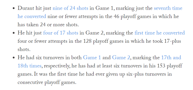 杜兰特在第二场比赛17投4中,生涯至今,他有128场季后赛至少出手17次,而这是他第1次进球不多于4个。