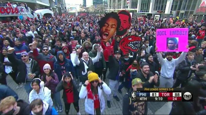 恩比德坐在替补席搂着哈登,两人都是一脸失落和沮丧;G3赢球赛后,恩比德豪言要横扫猛龙,如今横扫已成泡影,不过G5将重回费城,他们有望在第五场拿下系列赛。