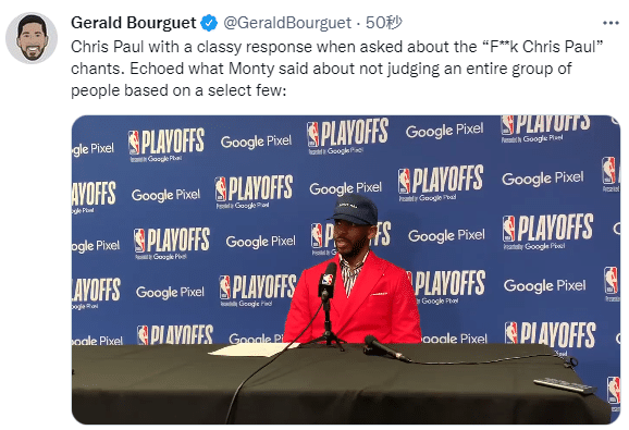 赛后接受采访时,保罗棒球帽上印着“assist man(助攻达人)”,并且回应鹈鹕球迷的骂声,保罗表示不能少数人的行为来判断整个群体,和蒙蒂的观点相呼应。