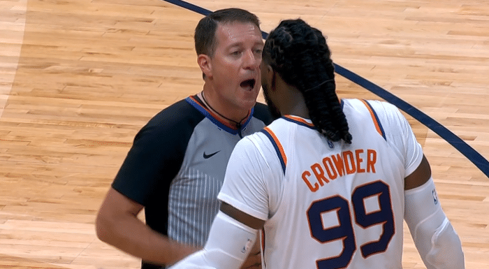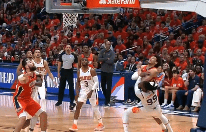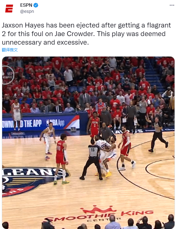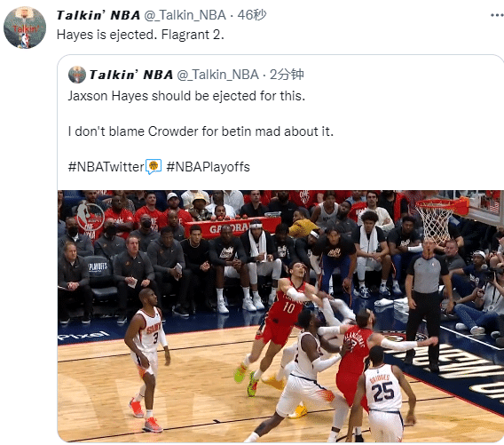 JRS直播网04月23日讯,NBA季后赛太阳再战鹈鹕,第二节场上发生意外事件,鹈鹕球员海耶斯推倒克劳德险引冲突,吃到二级恶意犯规直接被驱逐离场,克劳德吃到技术犯规。