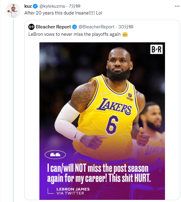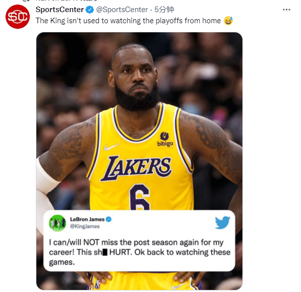 美媒SportsCenter发推:国王不习惯在家中看季后赛;TheScore发推:勒布朗一直坐在沙发上看季后赛,他对此十分不开心;美媒《露天看台》发推:勒布朗发誓再也不会错过季后赛。