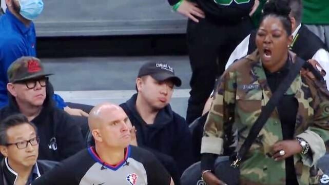 画面中,旺达从场边座位上站起来,冲着面前的一位裁判喷个没完。被喷的裁判是 Jacyn Goble ,他仿佛完全没听到抱怨,连个反应都没有。离旺达不远的地方,就是篮网老板蔡崇信,他也赶到波士顿现场观战,旺达大骂裁判时,蔡老板一脸平静,关注着场上的比赛,也没往旺达这个方向看。