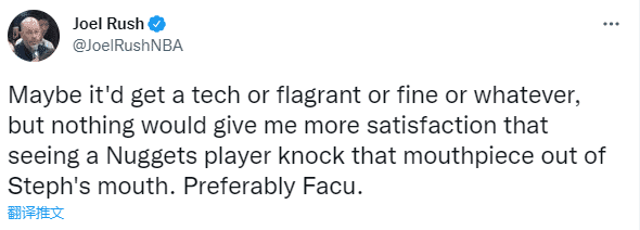 掘金记者Joel Rush发推写道:也许会被吹恶意犯规或是技术犯规,还有罚款等等,但没有什么能比看到掘金球员把库里的牙套从他嘴里打出来更让我满意了。这活儿最好是坎帕佐来干。
