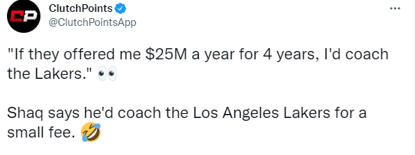 奥尼尔戴着一副造型独特的墨镜参加节目,一脸平静地表示:如果他们给他一份每年2500万美元并且是4年的合同,我愿意执教湖人队。