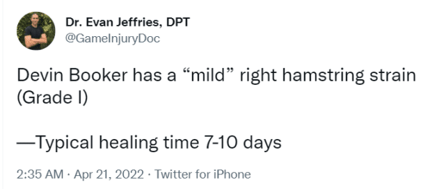 医学专家Evan Jeffries曾公布腿筋伤势的恢复时间表,如果只是腿筋紧张,那就是每日观察,如果是一级拉伤,预计要缺席7-10天,如果是二级拉伤,预计要缺席几周。现在来看,布克的情况有可能是一级,名记沃纳罗斯基透露他可能缺席G3和G4两场比赛,也符合这样的判断。