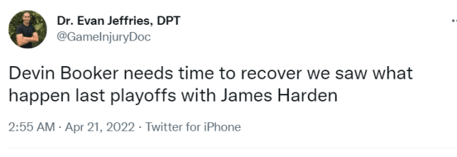 Evan在布克伤情公布后,还补充表示:“布克需要时间来恢复,我们在上赛季的季后赛看到过哈登也出现类似的情况。”