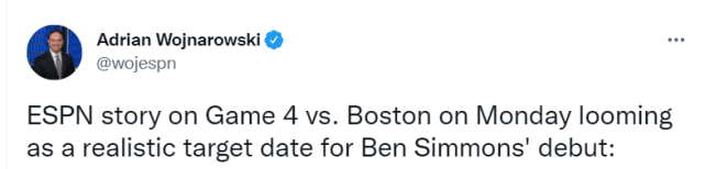 JRS直播网04月21日讯 ,ESPN名记沃纳罗斯基报道,消息人士告知,篮网球星本-西蒙斯通过这周的训练以及对未来几天的进展预期,已经将北京时间下周二(4月26日)的系列赛G4定为本赛季处子秀的现实目标。