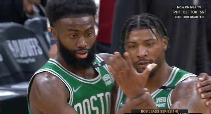 第四节最后阶段,杜兰特两罚全中追分,分差还有8分,这个时候斯玛特接到塔图姆的传球之后突破,他突进去一个勉强的抛投打进,分差重新拉大到两位数,也直接打停了篮网。得分之后的斯玛特看着自己的手,确实很搞笑。而一旁的杰伦-布朗也上来开心的查看斯玛特的手,两人一边走,一边看斯玛特的手,他打进了非常关键的一球。