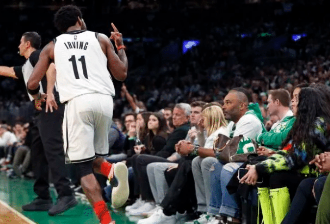 第一、欧文中投得分后朝凯尔特人场边球迷竖中指,这一幕发生在第三节。