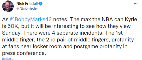 此前名记Nick Friedell列出欧文会被罚款的四大不妥举动,并且表示他最多会被罚款5万美元,果不其然,最终欧文收到这样的罚单。