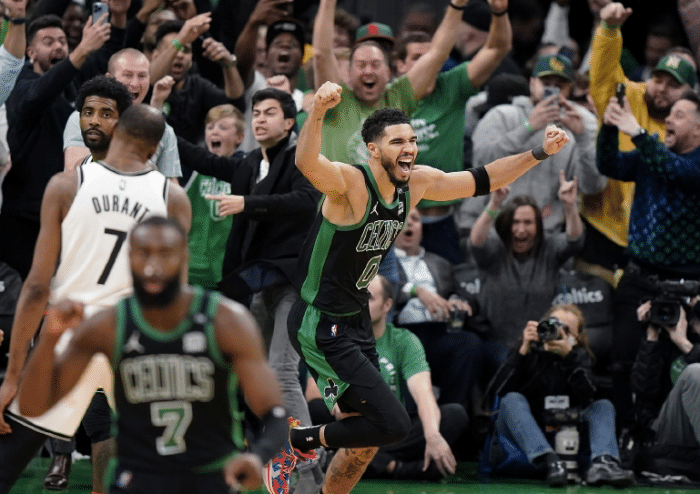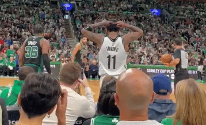 第二、欧文背对着球迷竖双中指,并且做出哭泣动作挑衅绿军球迷,这一幕发生第四节篮网反超比分时。