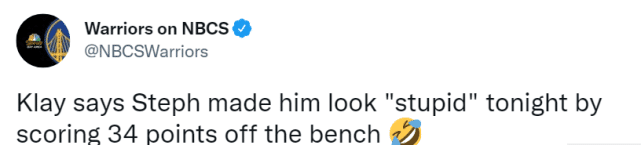 克莱目前已经解除上场时间限制,他表示只想做好自己,挡拆出手投篮,打出强硬的防守,还有转移好球。聊到连续两场替补出战的库里,克莱调侃道:“库里让我看起来很菜,库里现在还有上场时间限制,却拿下了34分!我也想这么做,但斯蒂芬(库里)就是斯蒂芬,对他来说,这很容易。”克莱的这番话,让现场嘉宾们哈哈大笑。