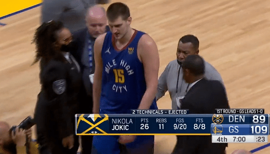 来到第四节,眼看局面已经完全失控,约基奇的暴脾气也完全控制不住。在一次进攻不中之后,约基奇摘下牙套直接质疑裁判为什么不吹犯规。结果,裁判也不和约基奇废话,直接给了他第二次技犯,将约基奇驱逐。镜头给到全景时,汤神正露出笑容,场面对比很扎心。