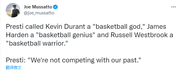 JRS直播网04月19日讯 ,雷霆总经理普雷斯蒂接受媒体采访,公开盛赞昔日的雷霆三少,直言:杜兰特是篮球之神,哈登是篮球天才,威少是篮球战士,还表示:我们不是在和自己的过去竞争。