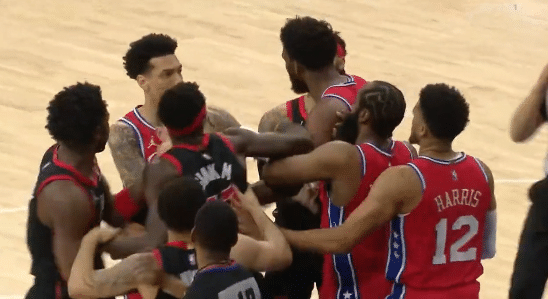 JRS直播网04月19日讯 ,NBA季后赛76人再战猛龙,比赛一开始场上就发生小冲突,恩比德和阿奴诺比相互推搡,哈登等球员劝架,最终两人都吃到技术犯规,冲突后恩比德杀红眼,单节19分太疯狂。