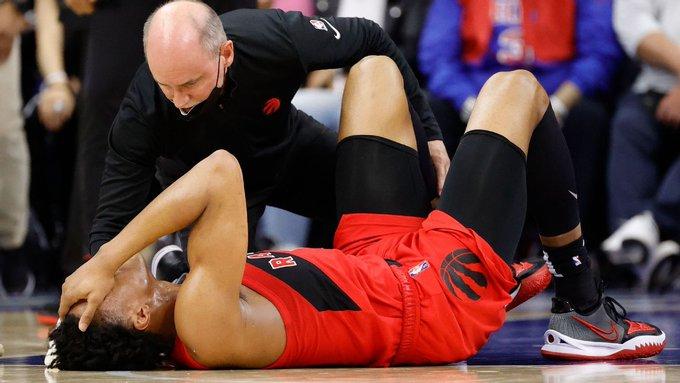在猛龙和76人季后赛首轮G1比赛中,第四节9分06秒,巴恩斯在防守时不幸被恩比德踩到脚背,导致脚踝90度扭伤;随后巴恩斯捂着脚踝倒地不起,最终被两人搀扶离场,返回更衣室接受检查,因伤退出比赛,初步确诊为左脚踝扭伤。
