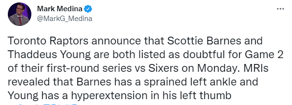 猛龙4号秀斯科蒂-巴恩斯的核磁检查结果出炉,据名记mark medina报道,猛龙官方宣布,巴恩斯的检查结果显示左脚踝扭伤,大概率缺席与76人系列赛第二场比赛(25%可能性),之后曝缺席G2恐缺席首轮;赛迪斯-杨伤情确诊为左手拇指过度伸展,同样是小概率出战。