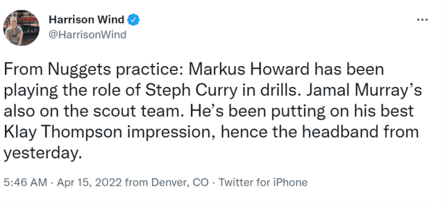 掘金记者Harrison Wind表示,穆雷参加了今日的全队合练,他出现在替补组,并模拟克莱-汤普森为队友陪练,为此他甚至戴上了发带。小将马库斯-霍华德在训练中模拟了库里,两人扮演水花兄弟,帮助主力阵容备战。