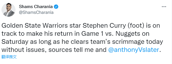 如今名记确认,若库里今天训练后感觉良好,他就会在勇士和掘金系列赛G1复出。