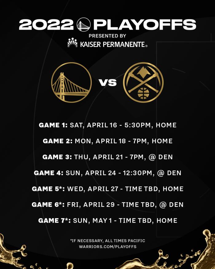 JRS直播网04月14日讯 ,勇士官方也发布了和掘金季后赛首轮的具体赛程——G1是当地时间4月16日下午5点30分,G2是4月18日下午7点,G1和G2都是勇士主场;G3和G4都在掘金主场,时间分别是4月21日下午7点和4月24日下午12点30分;若有必要的话,G5是4月27日回到勇士主场,G6是在4月29日掘金主场,G7是5月1日勇士主场。