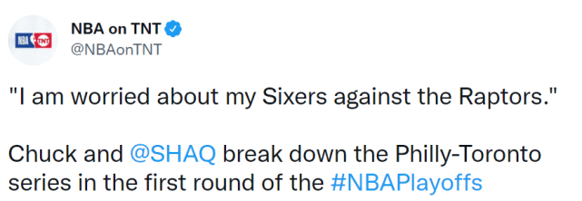 在TNT的季后赛前瞻节目中,前NBA球星巴克利和奥尼尔谈到了76人和猛龙这轮系列赛。巴克利担心自己的老东家76人在首轮就会遇到大麻烦。