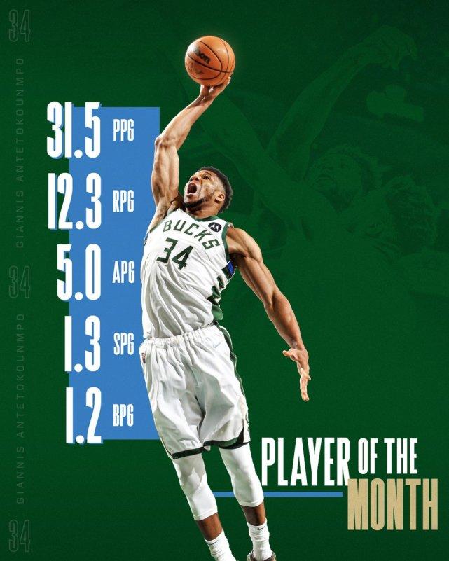 字母哥在3-4月场均贡献31.5分12.3篮板5助攻1.3抢断1.2盖帽,投篮命中率57.9%,率领雄鹿获得14胜6负的战绩。这是字母哥生涯第9次当选月最佳球员,也是自2020年1月以来的首次。雄鹿官方晒图祝贺字母哥当选。