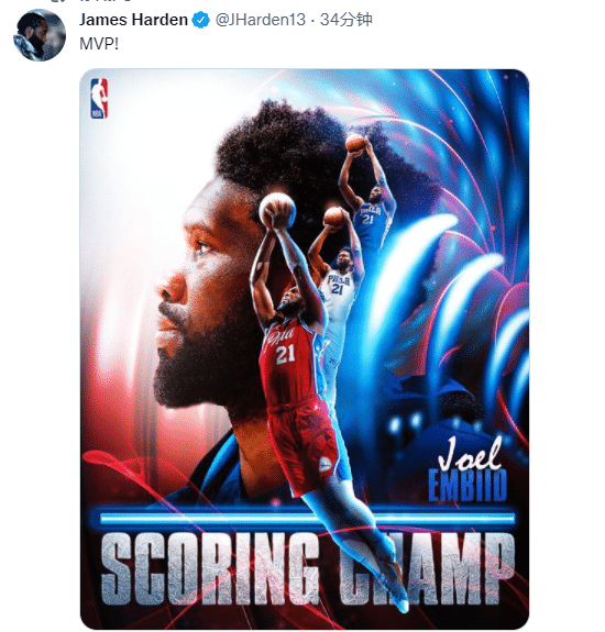 JRS直播网04月12日讯 ,NBA官方正式公布最后一周的东西部周最佳球员,恩比德和东契奇分别当选,NBA还官宣恩比德夺得得分王,哈登转发海报并且力挺恩比德MVP。