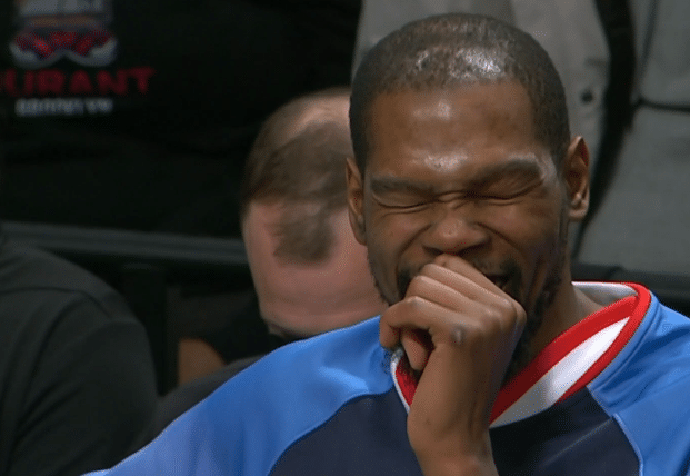 值得一提的是,第二节杜兰特休息时,镜头拍到阿杜眯着眼笑一幕,杜小帅太开心了。