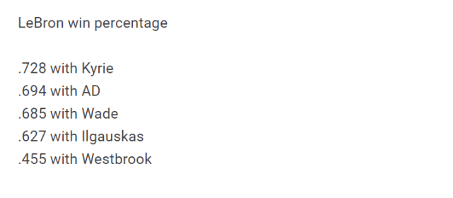JRS直播网04月10日讯 ,美媒StatMuse公布了詹姆斯与五位队友搭档的胜率,其中,他和威少联手出战的胜率只有45.5%,引起热议。看来,两人在一起确实不合适,连胜率都没超过五成。